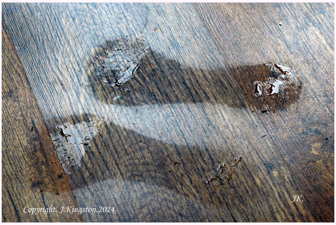 The second image appears in the conservatory on January 5, 2024, at 10:50 a.m., with the print facing south east. The semi-porous linoleum flooring has absorbed part of the wet footprint, which is very similar in shape and size to the first image. I have gathered additional information regarding the origin of this footprint, along with the two initials.