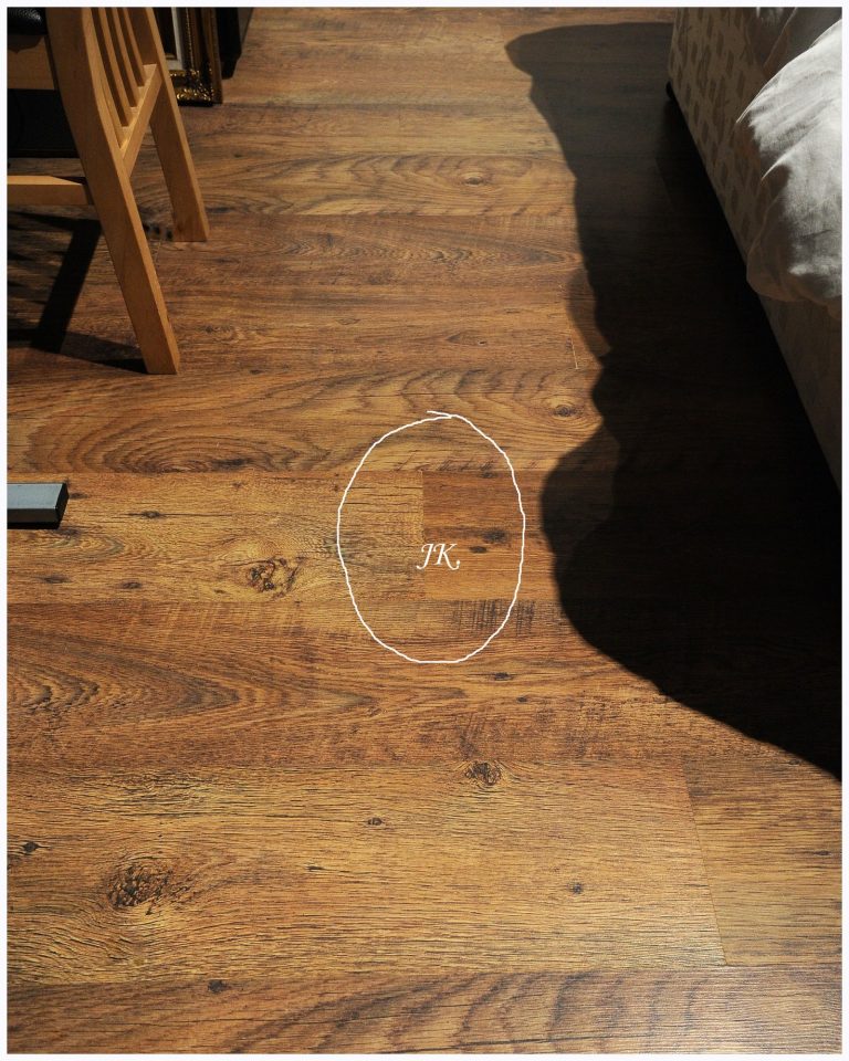 The second footprint, the first recorded image, was located by the base of the bed on 18/10/2017 at 4:50 a.m. The distinctive grain and panels of the laminate flooring clearly indicate the print's precise size and position in the room. It's fortunate that the print is almost perfectly aligned with the panel divisions, 7.5 in, apart.
