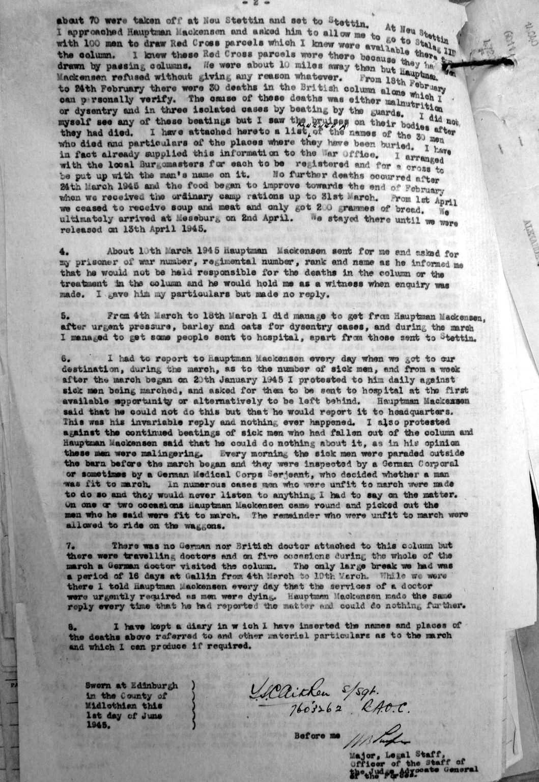 My mother mentioned that he once said he would share his experiences with me someday.. If only he had, it could have significantly impacted our relationship and my future. My instinct was the "March" was a defining episode in his story! I was determined to uncover the conditions they had endured and the consequences they faced. I had been searching for the affidavit for some time. I had sent off for details with a fee to the National Archives offices in Kew, for a copy of the affidavit but they were returned without explanation. (Covid!?) Mmm! I almost put the thought of ever finding the Affidavit behind me! By sheer chance! I stumbled upon the Affidavit!