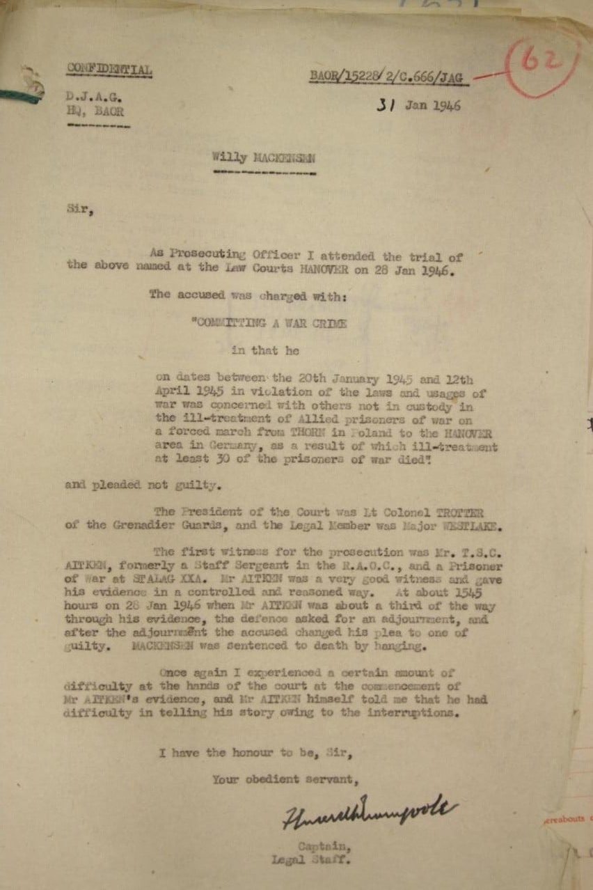 On December 15 1945, my father was discharged from the Army as medically unfit. A British POW, who was the senior officer on the march from XXA, "Staff Sargent Thomas Aitken" made a sworn affidavit as to the terrible conditions on the Northern route of that particular march. Based on his affidavit, the senior German officer leading the march, Hauptmann Willie Mackensen, was tried, convicted of war crimes, and executed by hanging at Hamelin Prison, Germany, on March 8, 1946. The complete affidavit, detailing the conditions, times of death, causes, and burial locations for each soldier along the route, is available here.
